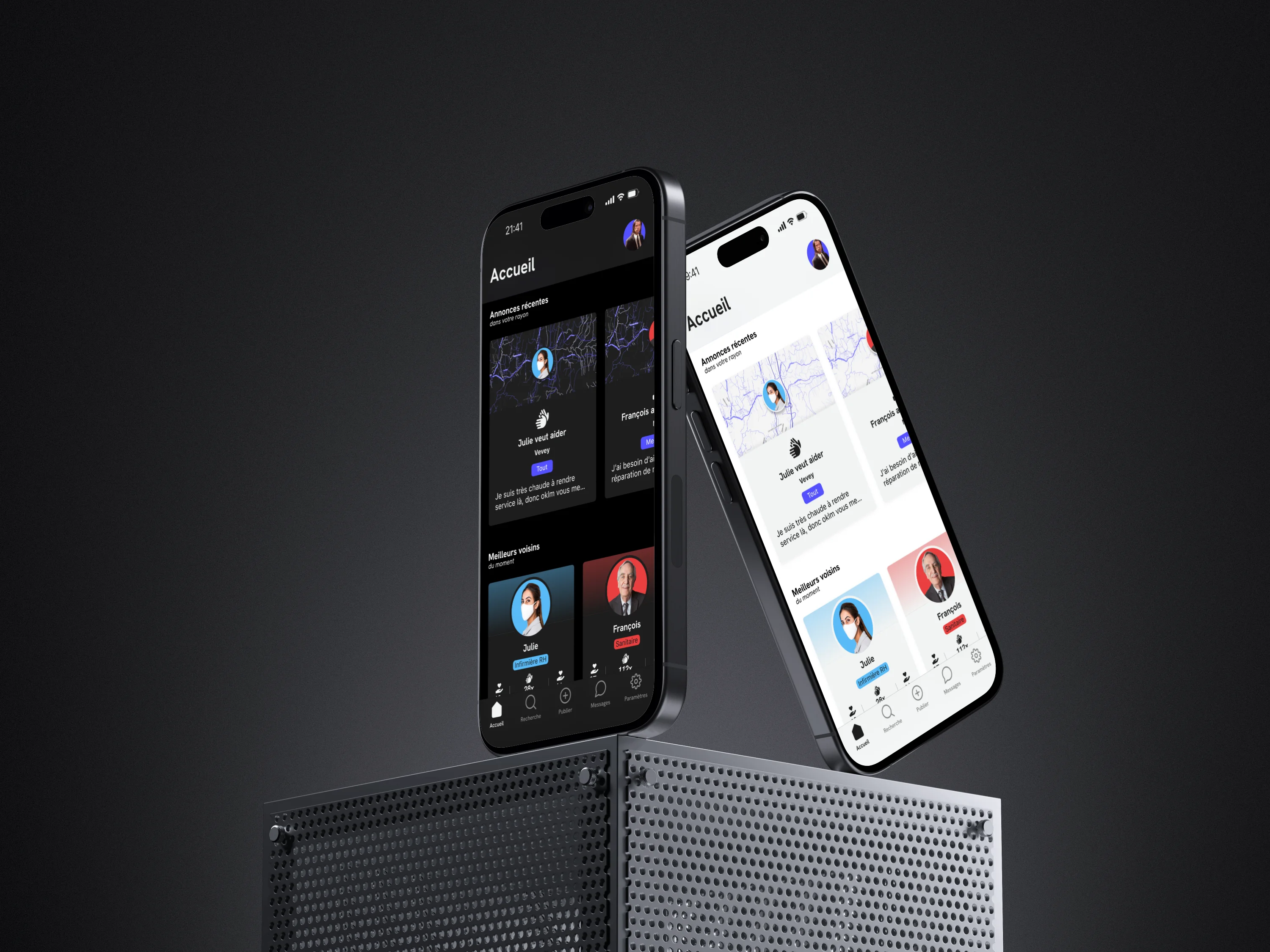 Application de mise en relation entre voisins. Maquette avancée sur Figma avec interface utilisateur moderne et intuitive.